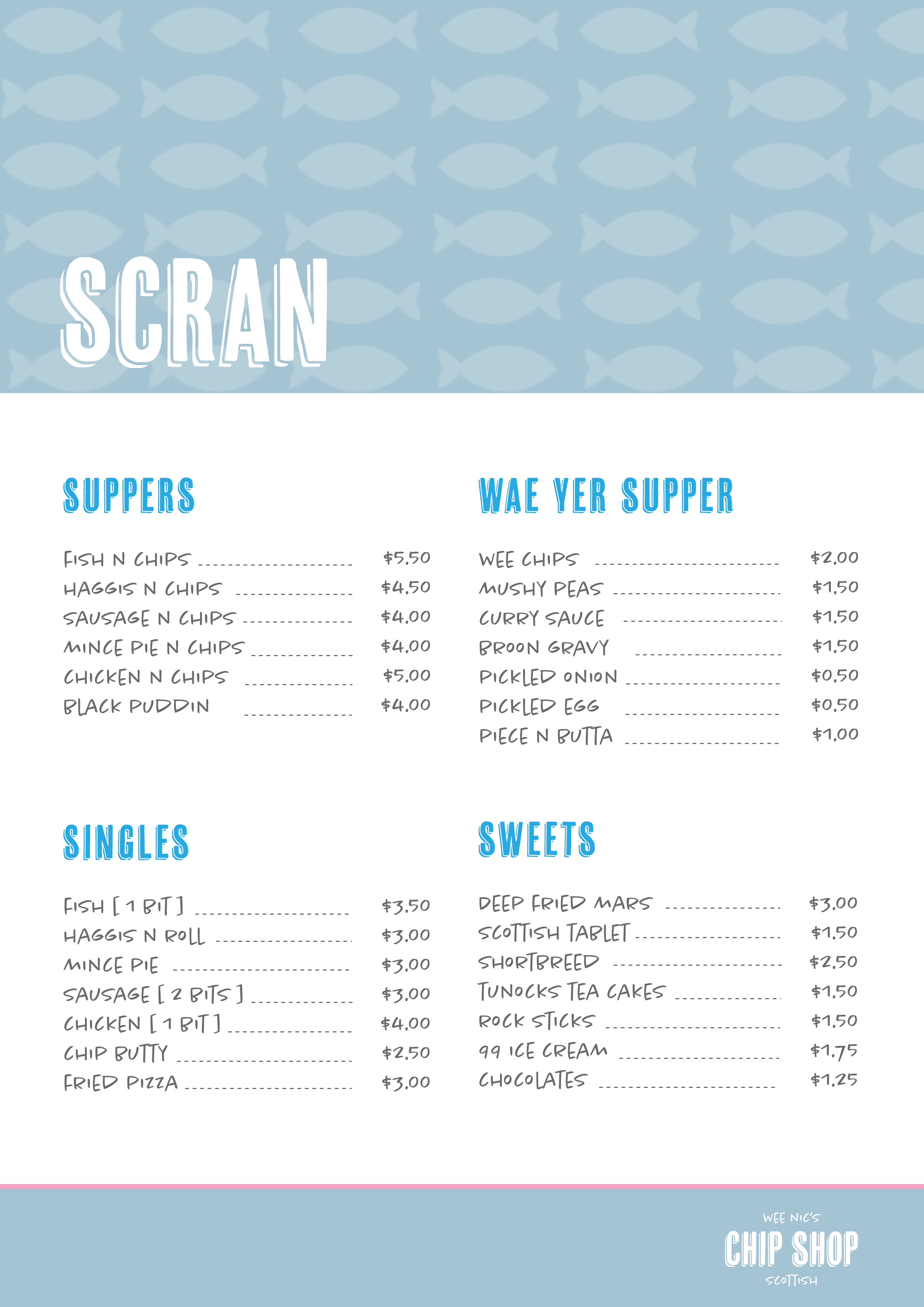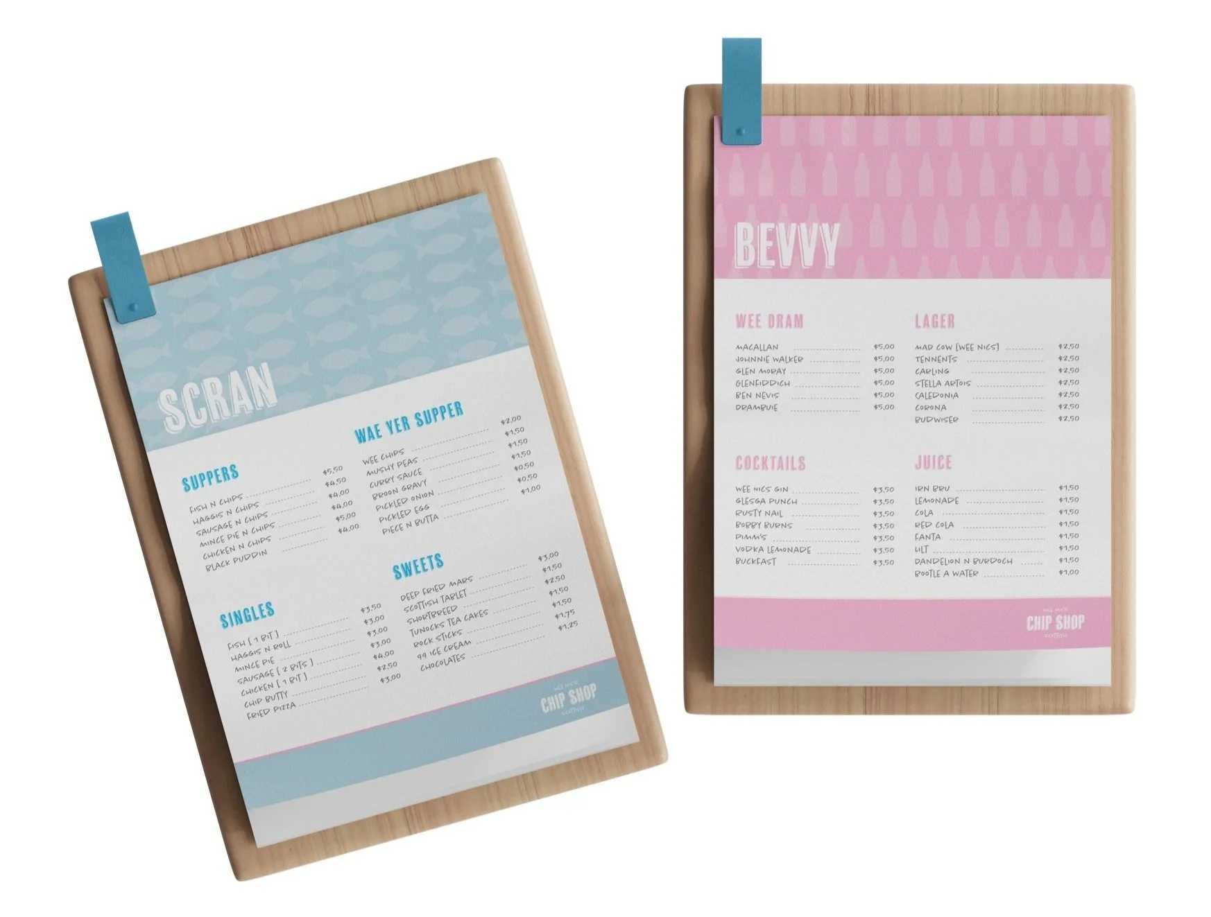 Fish and Chips, a classic British dish dating back to the 17th century, traditionally wrapped in newspapers, are enjoyed by the seaside in your car amidst freezing, windy weather. In Scotland, pair it with Irn-Bru. Wee Nic's Scottish Chippy draws inspiration from my mom, Nicola—a skilled cook and spirited Scot. The brand's identity captures a genuine Scottish voice, inviting consumers to connect with a uniquely positive and authentic space that mirrors Nicola's humorous personality and culture.